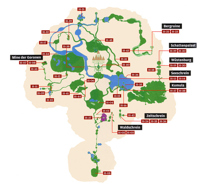 45. Herzteil: Hyrule Ebene (Ranelle) Gehe in Ranelle nördlich von Schloss Hyrule den nördlichen, felsigen Pfad entlang, bis zu einem freien Platz mit einer nach Westen ausgerichteten Höhle, die ein Felsblock versperrt. Beseitige Felsen und Eis mithilfe des Morgensterns. Nach drei Blockschiebe- rätseln findest du ein Herzteil. |