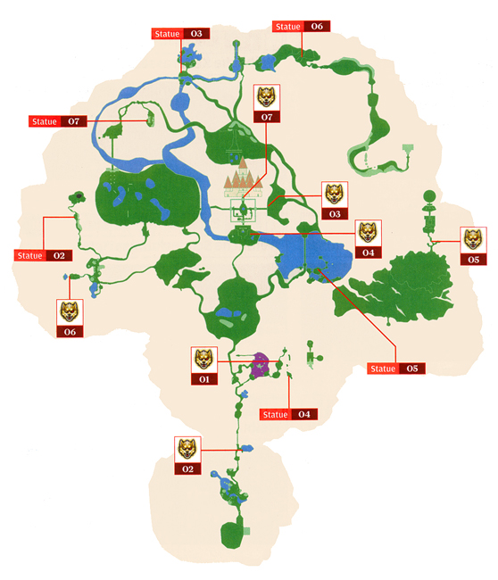 Findest du eine Statue, musst du als Wolf das Geheul nachahmen, indem du den Control-Stick nach oben bzw. nach unten drückst oder gar nicht bewegst. Stimmt das Geheul zweimal korrekt überein, erscheint in Hyrule ein goldener Wolf, wie es unsere Karte zeigt.